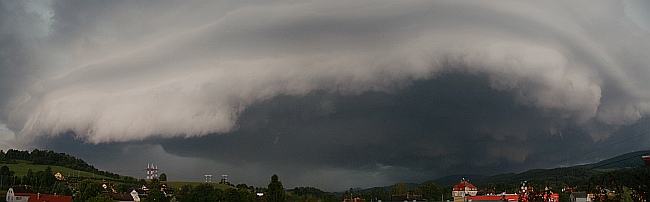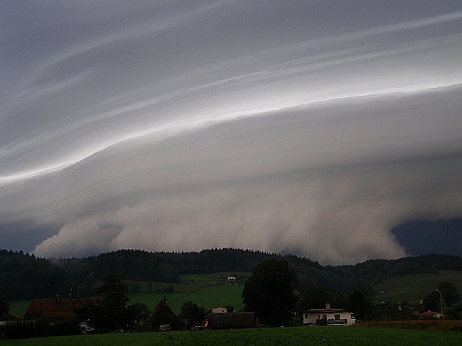 Shelf cloud - nasávání vlhkosti z lesa a její kondenzace 22.8.2012 08:30 - Velké Svatoňovice, fotoaparát Olympus SP510UZ, expozice 10/800 sekund, clona 2,8, autor: Tomáš Prouza