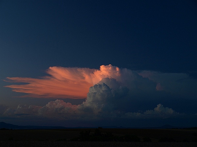 Cumulonimbus v severním pohraničí ČR, jehož vrchní část je ozářená zapadajícím sluncem 8.7.2012 21:24 - Mšené Lázně, fotoaparát Olympus E-510, expozice 1/6 sekund, clona 5,6, autor: Michal Janoušek