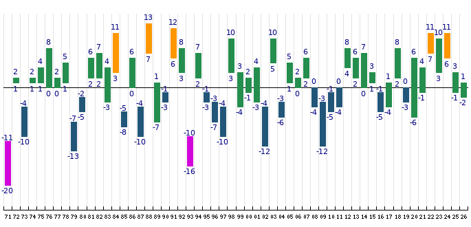 Graf zobrazuje roky, ve kterých byl v daný den zaznamenán náraz větru v km/h