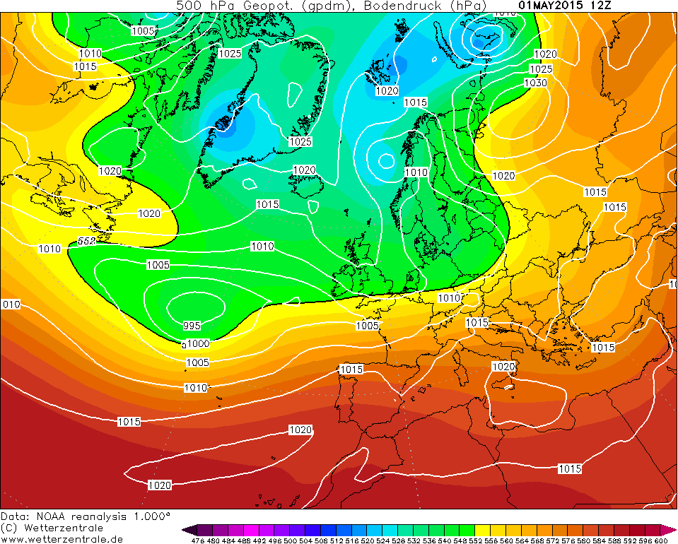 Teplota v 500 hPa - teplota v hladině 500 hPa včetně rozmístění tlakových útvarů