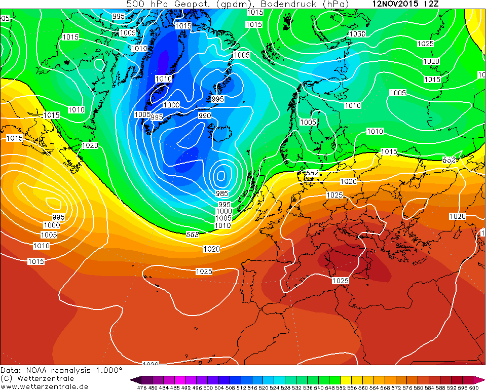 Teplota v 500 hPa - teplota v hladině 500 hPa včetně rozmístění tlakových útvarů