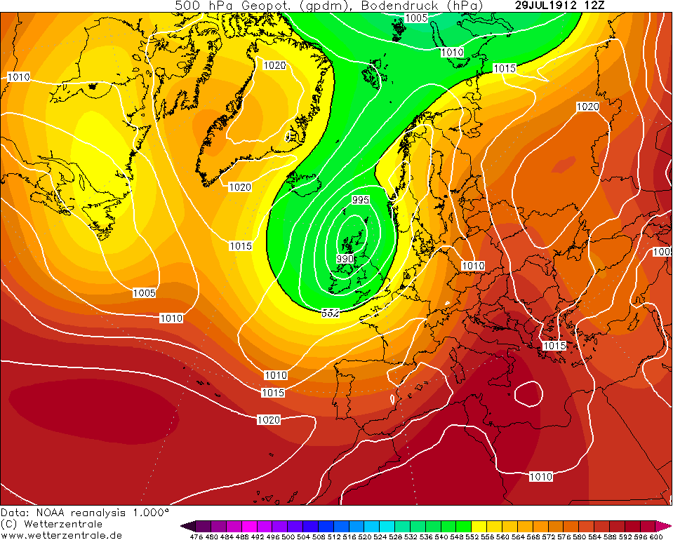 Teplota v 500 hPa - teplota v hladině 500 hPa včetně rozmístění tlakových útvarů