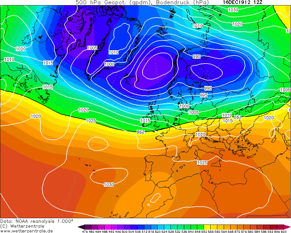 Teplota v 500 hPa - teplota v hladině 500 hPa včetně rozmístění tlakových útvarů
