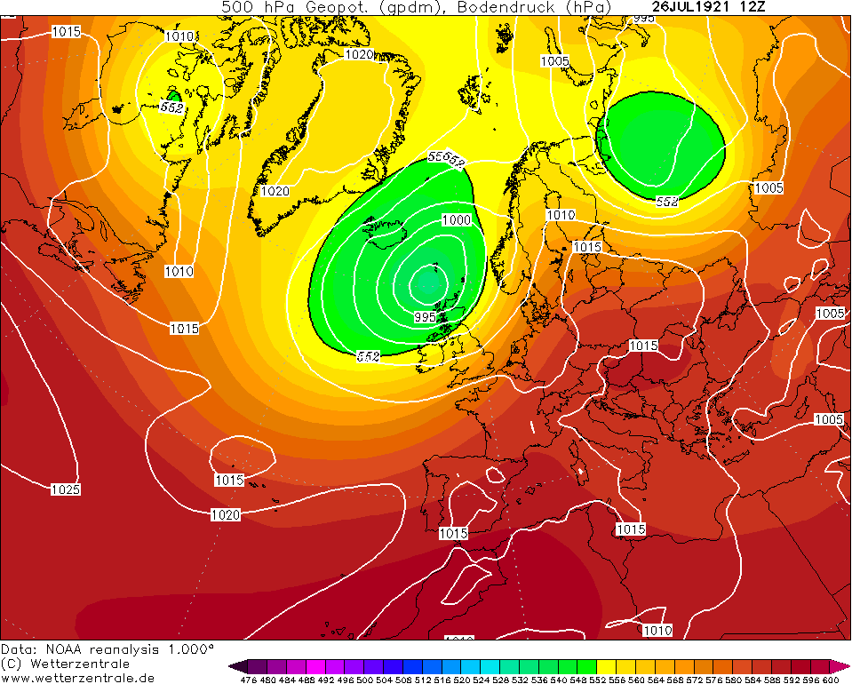 Teplota v 500 hPa - teplota v hladině 500 hPa včetně rozmístění tlakových útvarů