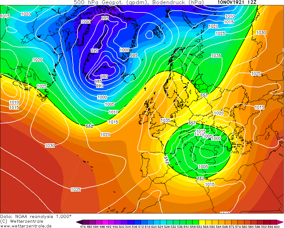 Teplota v 500 hPa - teplota v hladině 500 hPa včetně rozmístění tlakových útvarů
