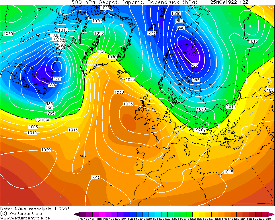 Teplota v 500 hPa - teplota v hladině 500 hPa včetně rozmístění tlakových útvarů
