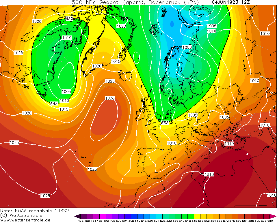 Teplota v 500 hPa - teplota v hladině 500 hPa včetně rozmístění tlakových útvarů