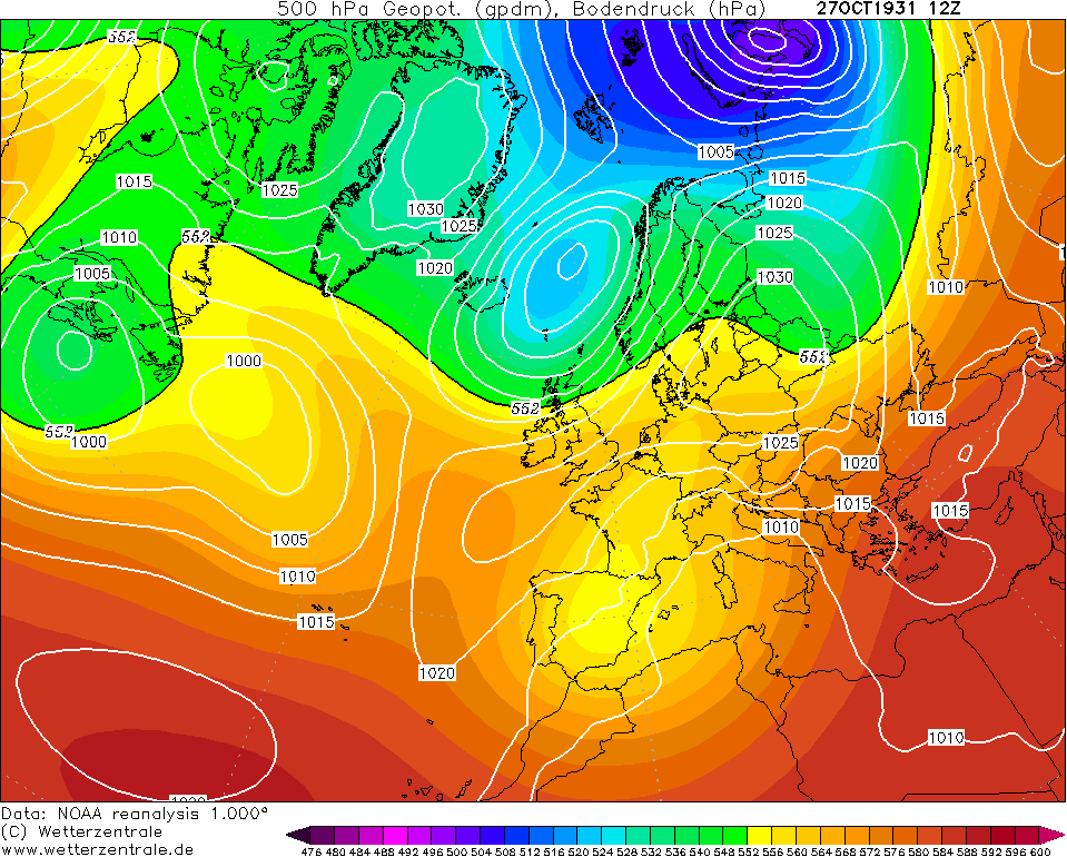 Teplota v 500 hPa - teplota v hladině 500 hPa včetně rozmístění tlakových útvarů