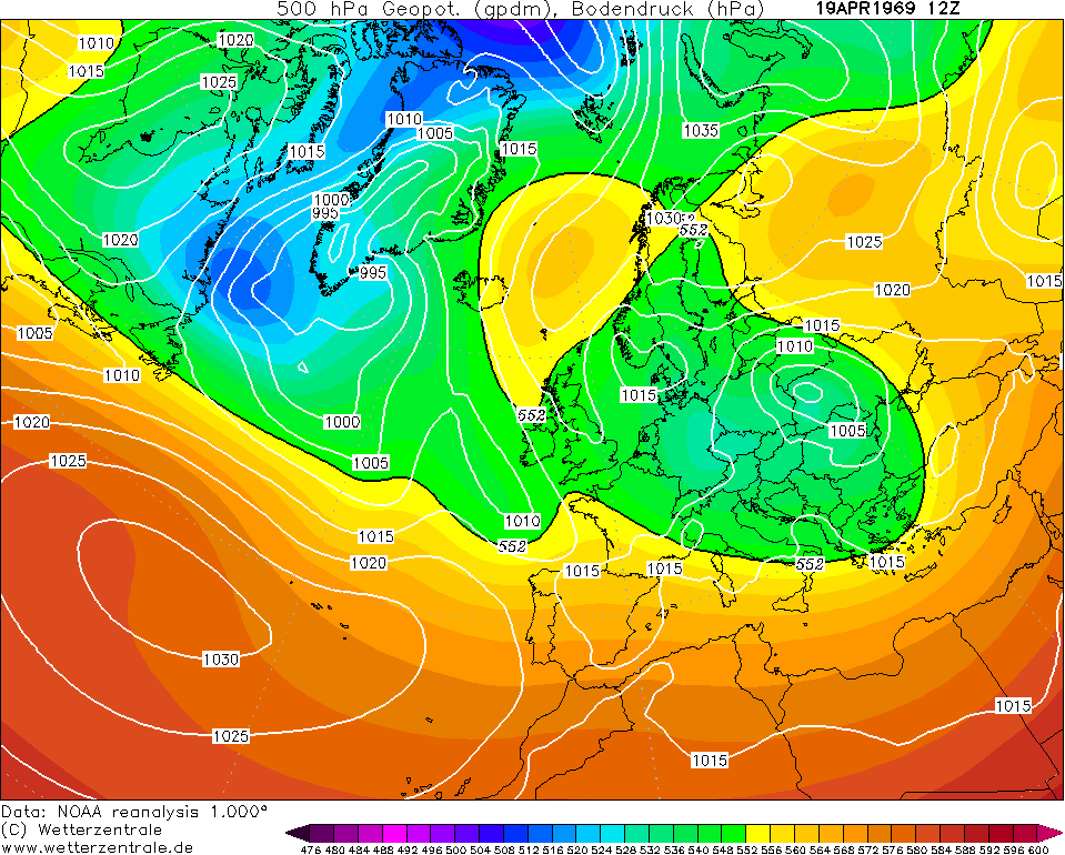 Teplota v 500 hPa - teplota v hladině 500 hPa včetně rozmístění tlakových útvarů