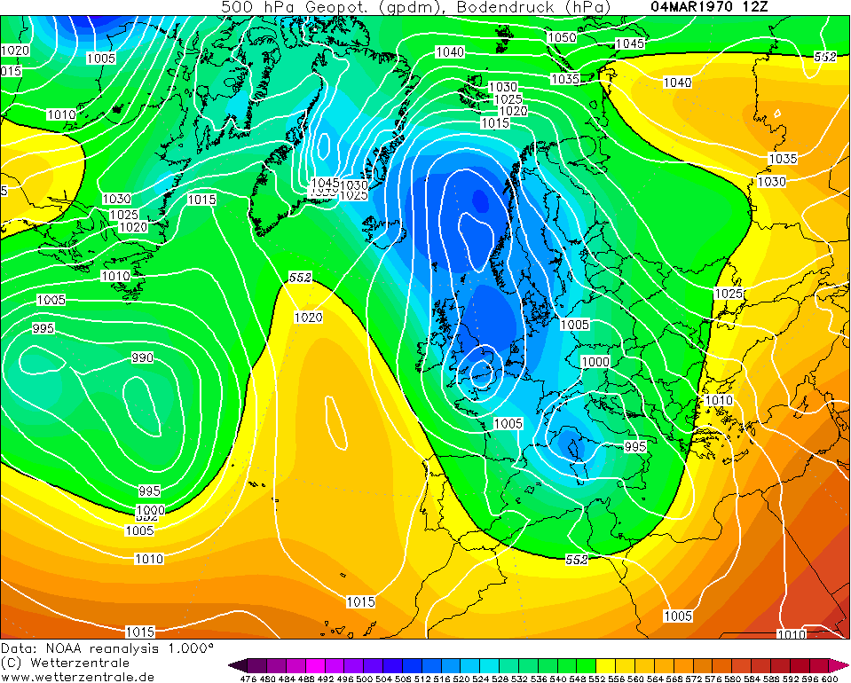 Teplota v 500 hPa - teplota v hladině 500 hPa včetně rozmístění tlakových útvarů