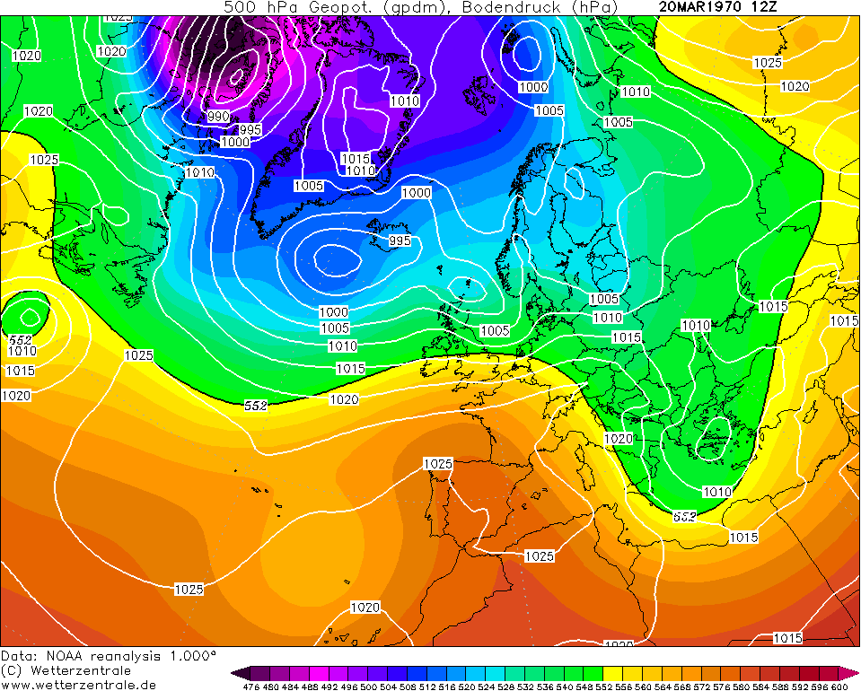 Teplota v 500 hPa - teplota v hladině 500 hPa včetně rozmístění tlakových útvarů
