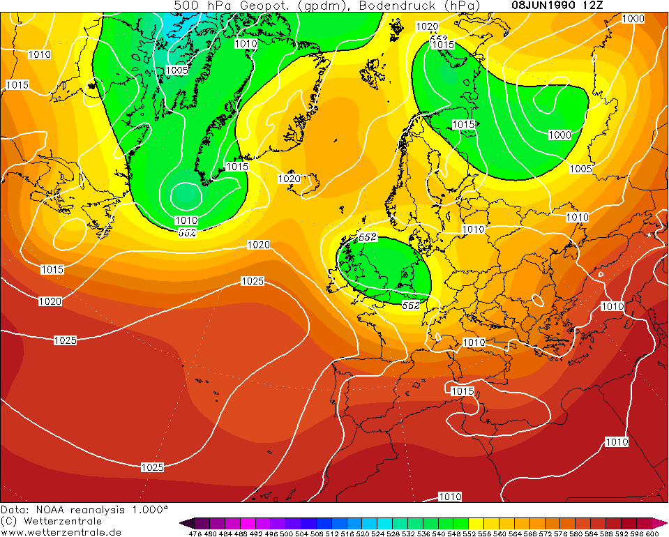 Teplota v 500 hPa - teplota v hladině 500 hPa včetně rozmístění tlakových útvarů