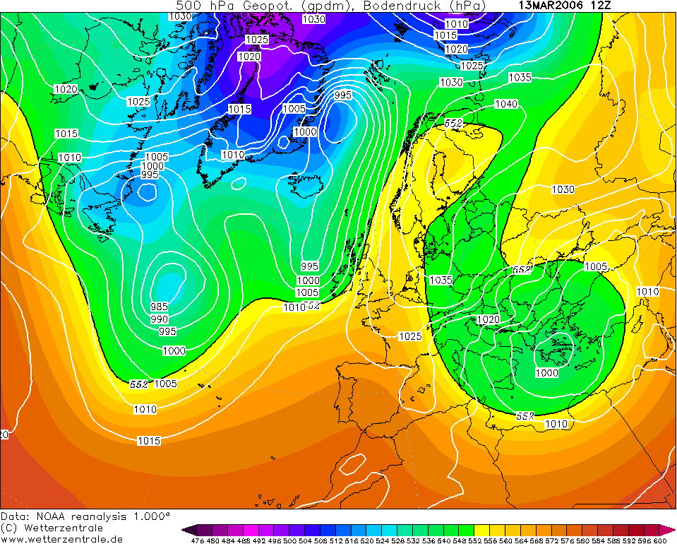 Teplota v 500 hPa - teplota v hladině 500 hPa včetně rozmístění tlakových útvarů