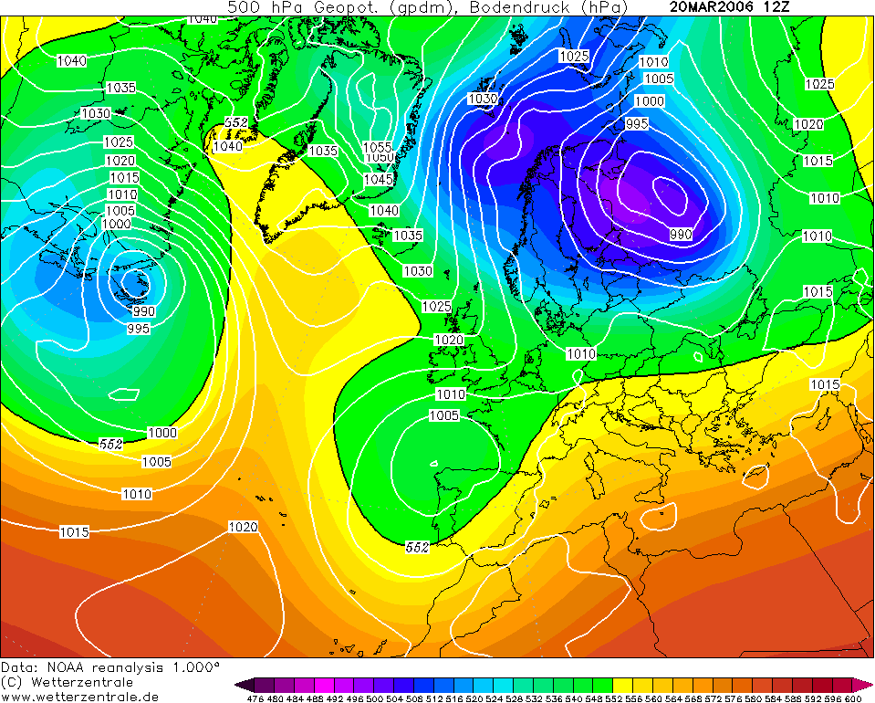 Teplota v 500 hPa - teplota v hladině 500 hPa včetně rozmístění tlakových útvarů