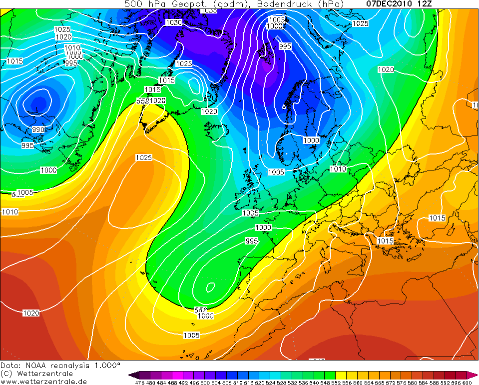Teplota v 500 hPa - teplota v hladině 500 hPa včetně rozmístění tlakových útvarů