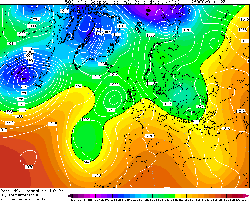 Teplota v 500 hPa - teplota v hladině 500 hPa včetně rozmístění tlakových útvarů