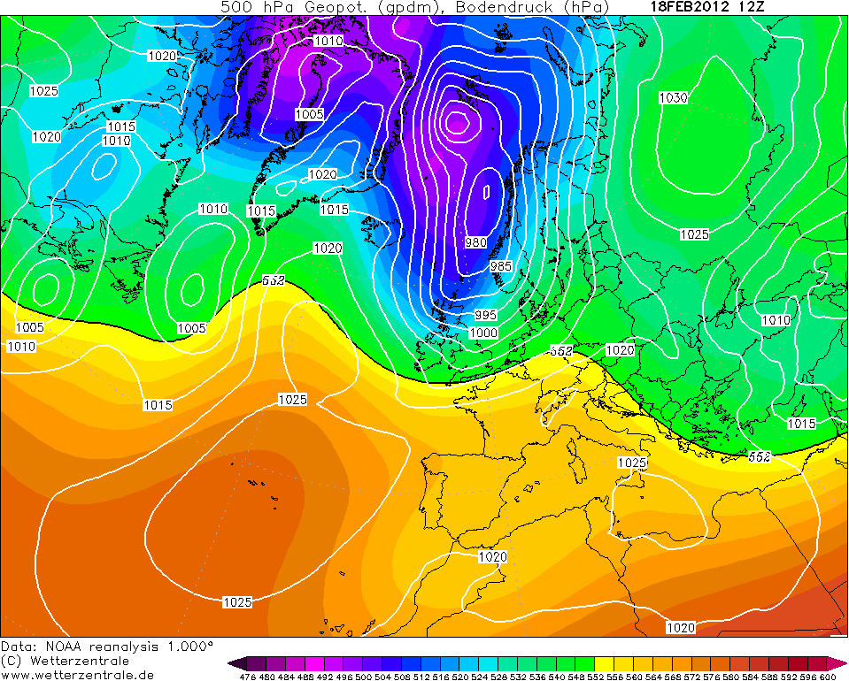 Teplota v 500 hPa - teplota v hladině 500 hPa včetně rozmístění tlakových útvarů