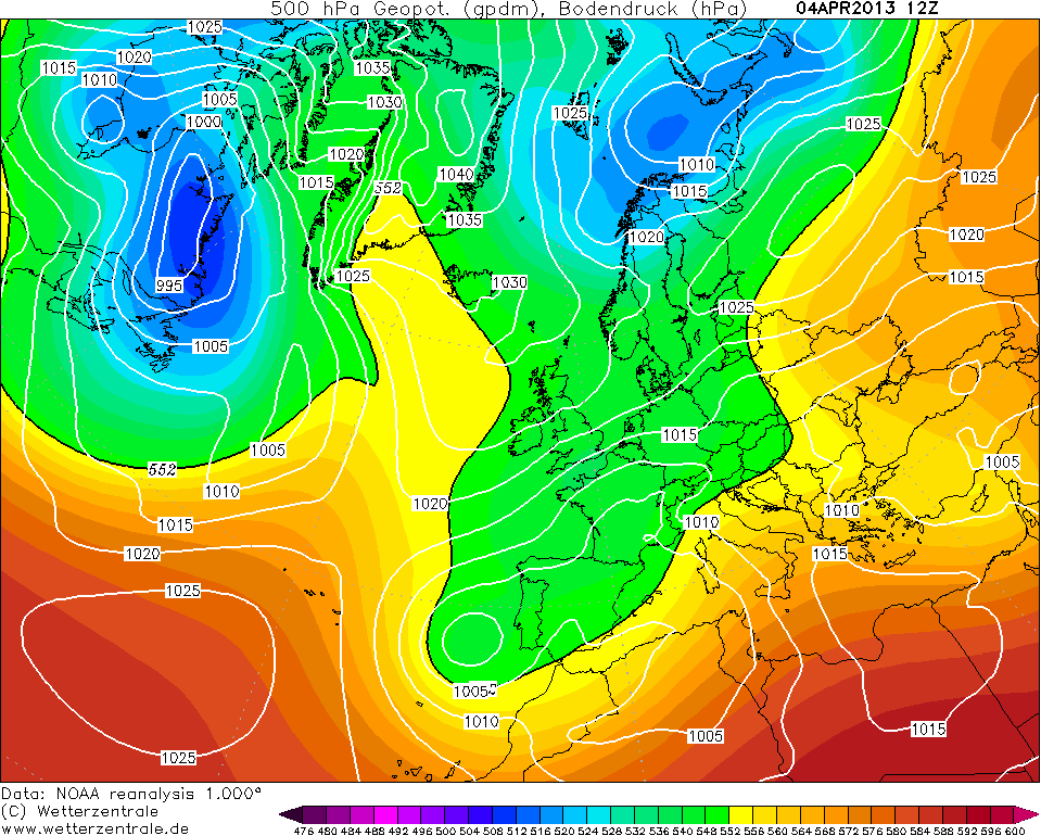 Teplota v 500 hPa - teplota v hladině 500 hPa včetně rozmístění tlakových útvarů