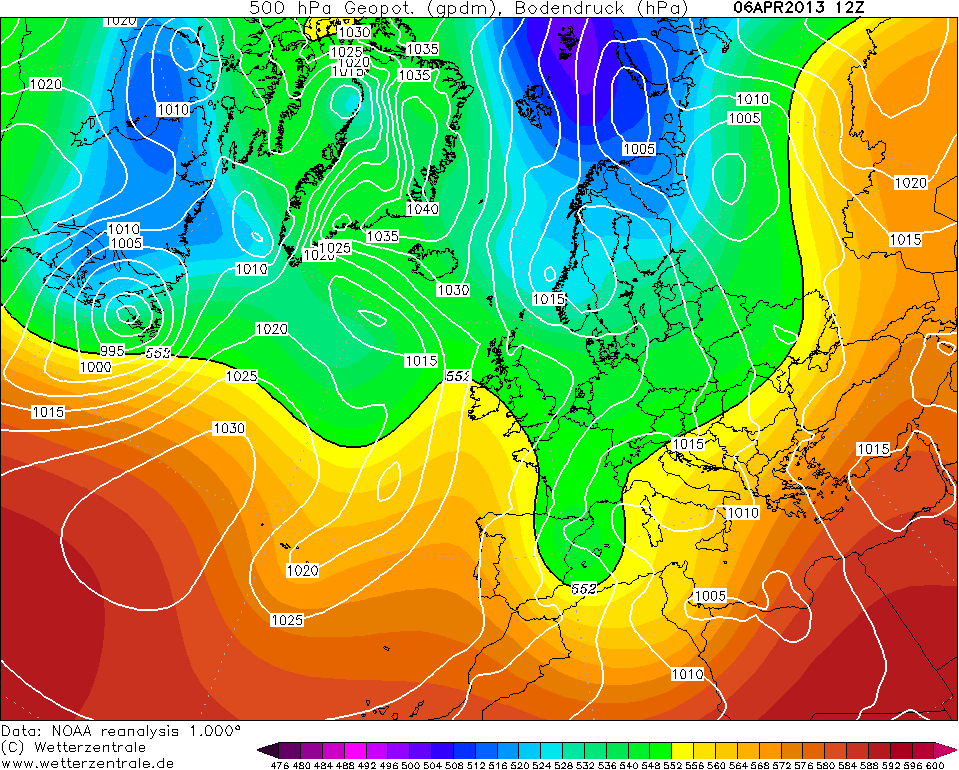 Teplota v 500 hPa - teplota v hladině 500 hPa včetně rozmístění tlakových útvarů