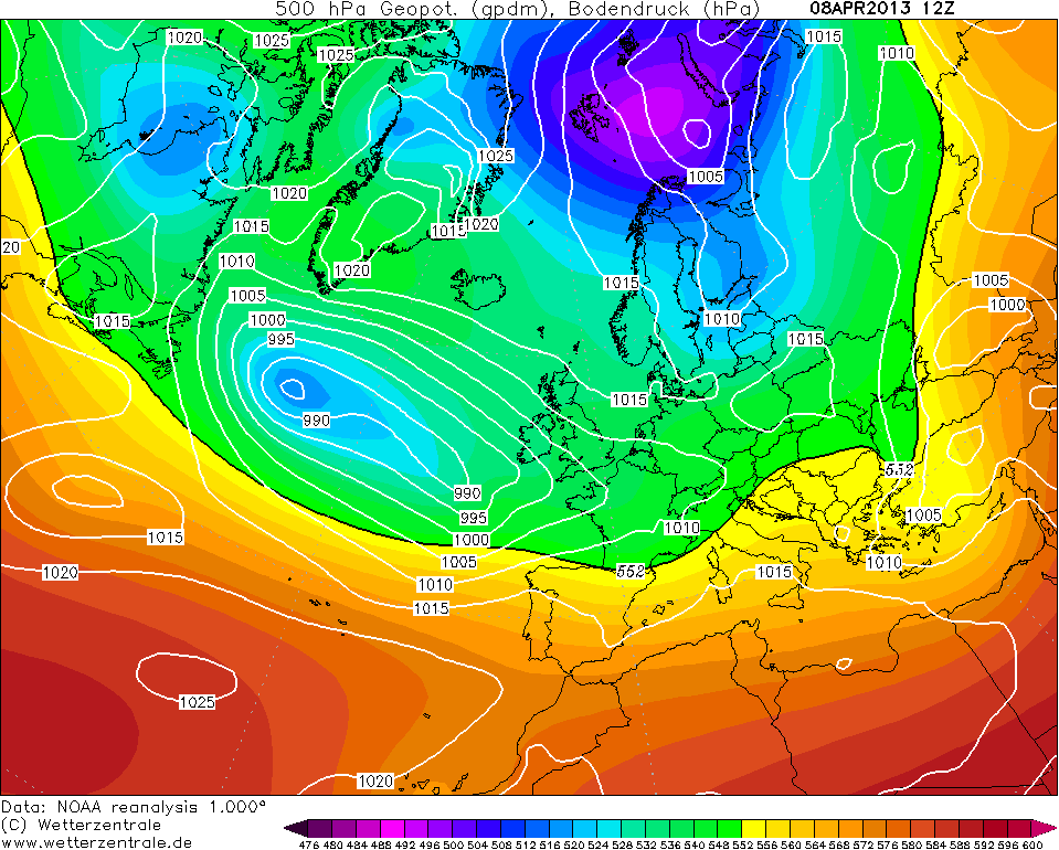 Teplota v 500 hPa - teplota v hladině 500 hPa včetně rozmístění tlakových útvarů
