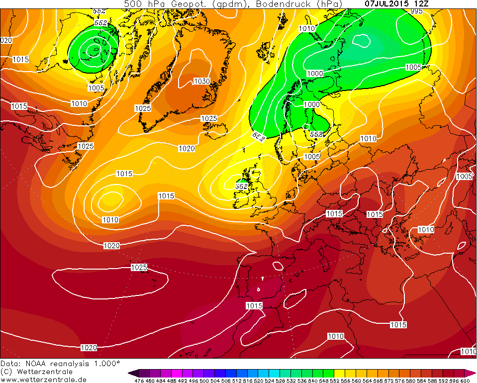 Teplota v 500 hPa - teplota v hladině 500 hPa včetně rozmístění tlakových útvarů