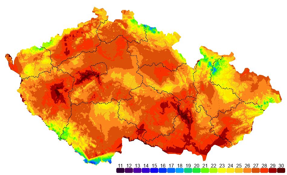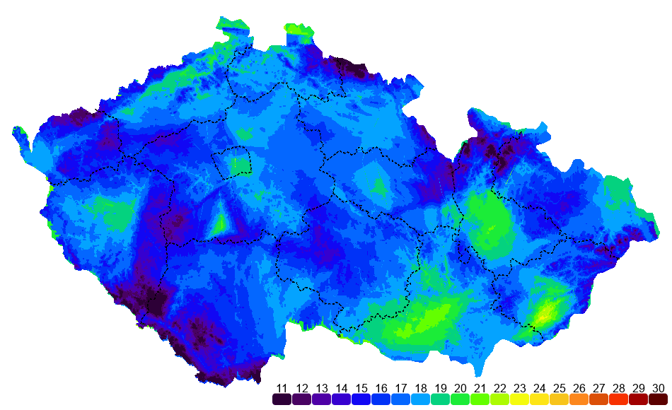 | Praha - Klementinum | 29 °C | 18.5 °C | - | 0 mm | - | 12.3 hod |