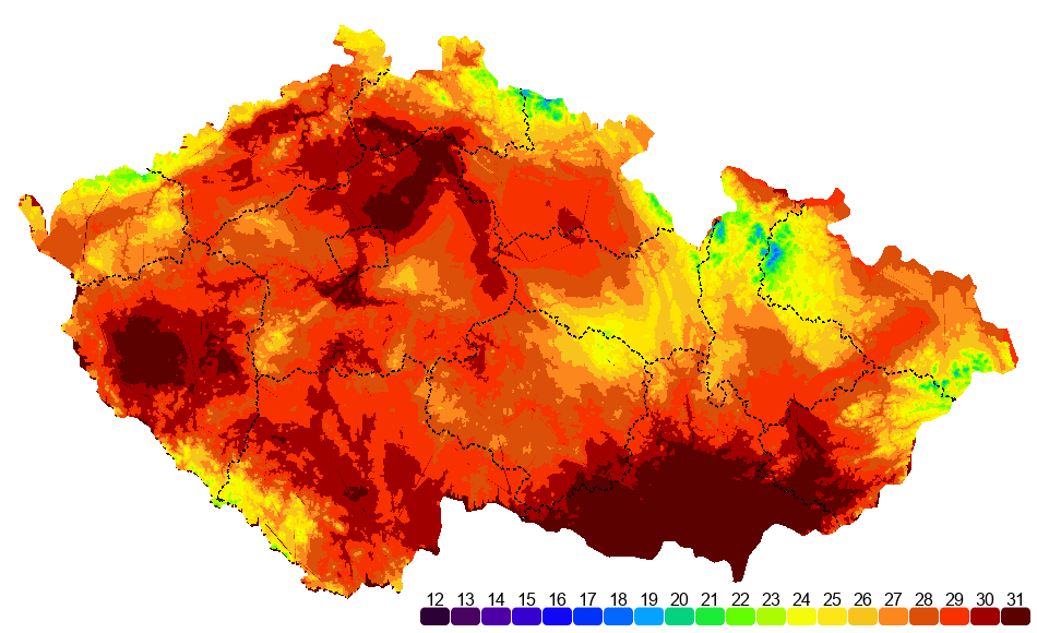 | Praha - Karlov | 30.7 °C | 17.4 °C | - | 0 mm | - | 9.4 hod |