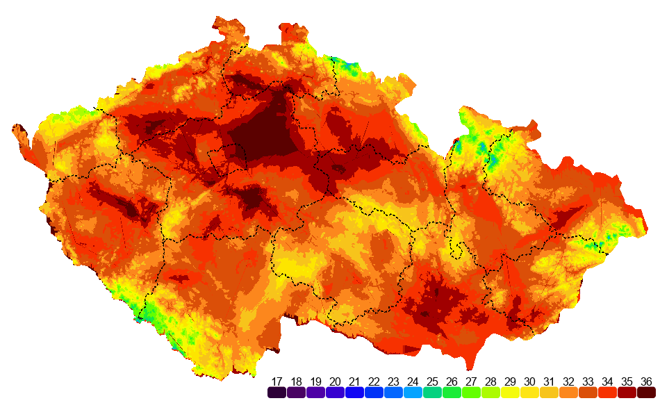 Jasno až polojasno, odpoledne a večer v západní polovině Čech až oblačno a ojediněle přeháňka nebo i bouřka. Nejvyšší denní teploty 32 °C až 36 °C, v Čechách v nížinách ojediněle až 37 °C.