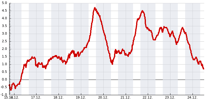 Spojnicový graf udává průměrnou rychlost větru změřenou za 10 minut v km/h, sloupcový graf zobrazuje nárazy větru (zobrazeny jen pokud přesáhnou 40 km/h).