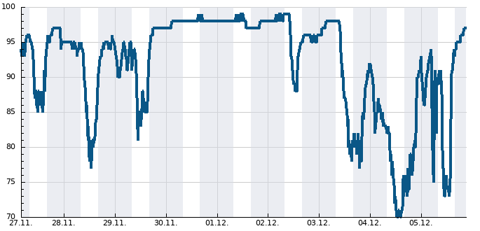 Spojnicový graf udává nejvyšší zaznamenanou průměrnou rychlost větru změřenou za 10 minut v km/h, sloupcový graf zobrazuje nejvyšší zaznamenané nárazy větru (zobrazeny jen pokud přesáhnou 40 km/h).