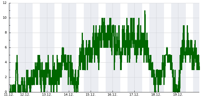 Spojnicový graf udává průměrnou rychlost větru změřenou za 10 minut v km/h, sloupcový graf zobrazuje nárazy větru (zobrazeny jen pokud přesáhnou 40 km/h).