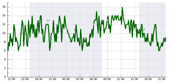Spojnicový graf udává průměrnou rychlost větru změřenou za 10 minut v km/h, sloupcový graf zobrazuje nárazy větru (zobrazeny jen pokud přesáhnou 40 km/h).