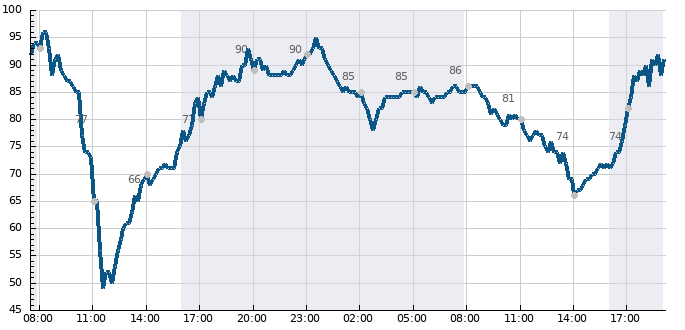 Spojnicový graf udává nejvyšší zaznamenanou průměrnou rychlost větru změřenou za 10 minut v km/h, sloupcový graf zobrazuje nejvyšší zaznamenané nárazy větru (zobrazeny jen pokud přesáhnou 40 km/h).