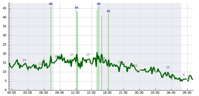 | 12:00 | -0.6 °C | SV, 15 km/h Náraz: 35 km/h | 79 % | 0 mm |