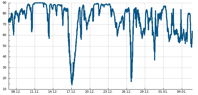 | Nejvyšší průměrná rychlost větru | 19.11.2004 | 10 km/h |