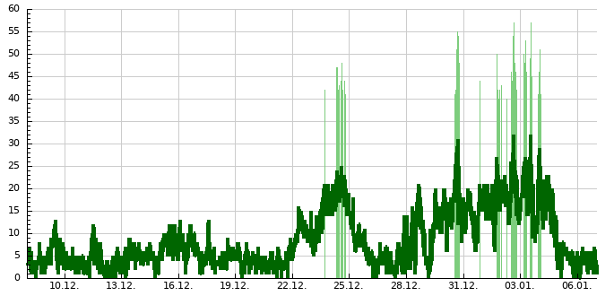 Spojnicový graf udává průměrnou rychlost větru změřenou za 10 minut v km/h, sloupcový graf zobrazuje nárazy větru (zobrazeny jen pokud přesáhnou 40 km/h).