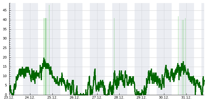 | Čas měření | Teplota | Vítr | Vlhkost | Srážky (dnes) |