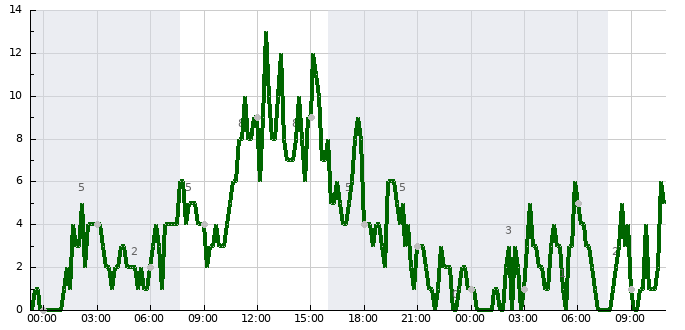 - Nejvyšší průměrná rychlost větru (12:30)