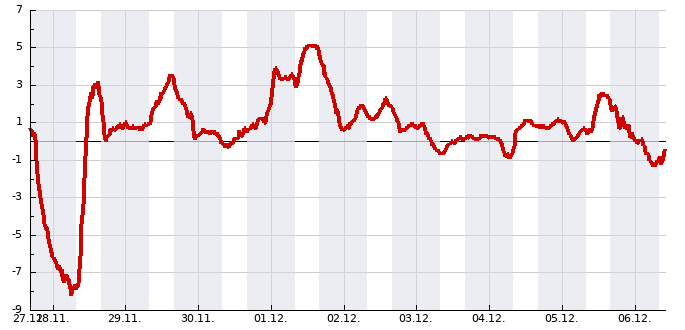 Spojnicový graf udává nejvyšší zaznamenanou průměrnou rychlost větru změřenou za 10 minut v km/h, sloupcový graf zobrazuje nejvyšší zaznamenané nárazy větru (zobrazeny jen pokud přesáhnou 40 km/h).