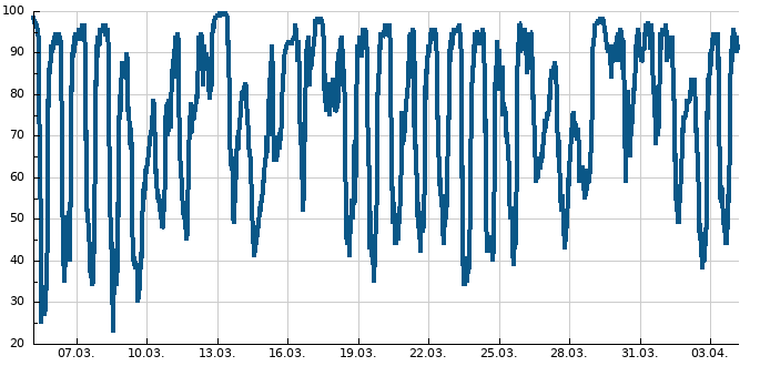 Spojnicový graf udává průměrnou rychlost větru změřenou za 10 minut v km/h, sloupcový graf zobrazuje nárazy větru (zobrazeny jen pokud přesáhnou 40 km/h).