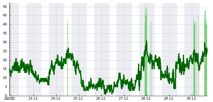 Spojnicový graf udává průměrnou rychlost větru změřenou za 10 minut v km/h, sloupcový graf zobrazuje nárazy větru (zobrazeny jen pokud přesáhnou 40 km/h).