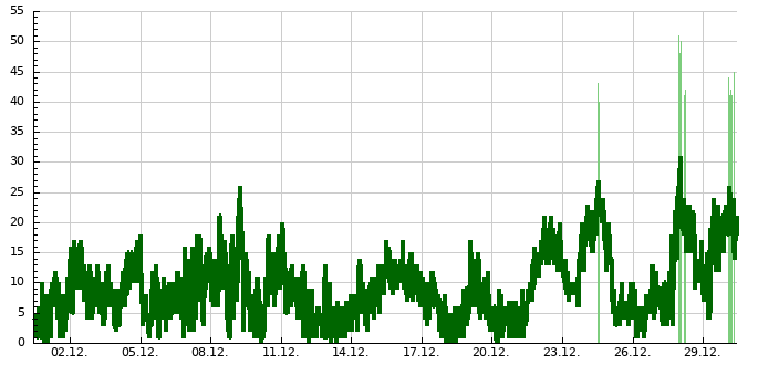 Spojnicový graf udává průměrnou rychlost větru změřenou za 10 minut v km/h, sloupcový graf zobrazuje nárazy větru (zobrazeny jen pokud přesáhnou 40 km/h).