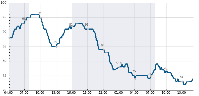 Spojnicový graf udává nejvyšší zaznamenanou průměrnou rychlost větru změřenou za 10 minut v km/h, sloupcový graf zobrazuje nejvyšší zaznamenané nárazy větru (zobrazeny jen pokud přesáhnou 40 km/h).