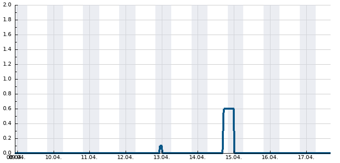 Spojnicový graf udává nejvyšší zaznamenanou průměrnou rychlost větru změřenou za 10 minut v km/h, sloupcový graf zobrazuje nejvyšší zaznamenané nárazy větru (zobrazeny jen pokud přesáhnou 40 km/h).
