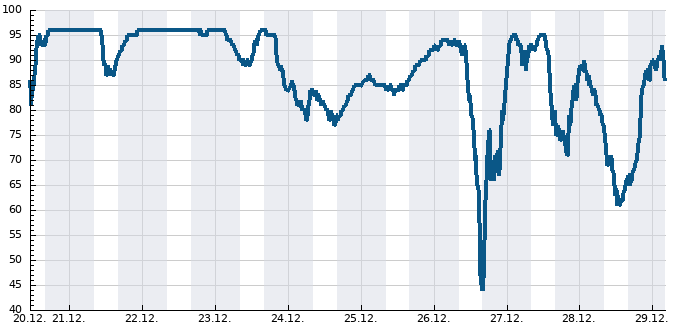 Spojnicový graf udává nejvyšší zaznamenanou průměrnou rychlost větru změřenou za 10 minut v km/h, sloupcový graf zobrazuje nejvyšší zaznamenané nárazy větru (zobrazeny jen pokud přesáhnou 40 km/h).