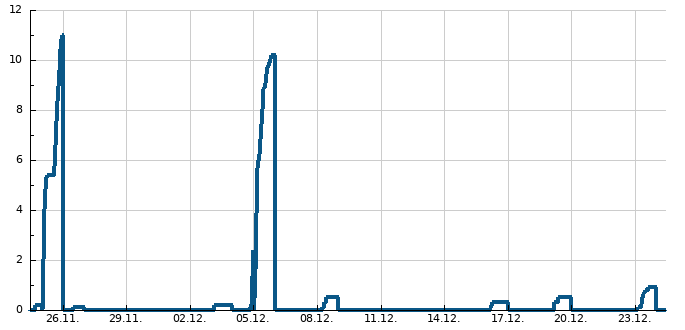Graf zobrazuje výšku sněhové pokrývky v průběhu měsíce, šedou čárou jsou znázorněny dlouhodobé průměry pro daný den.