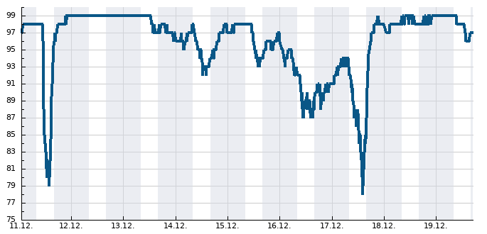 Spojnicový graf udává průměrnou rychlost větru změřenou za 10 minut v km/h, sloupcový graf zobrazuje nárazy větru (zobrazeny jen pokud přesáhnou 40 km/h).