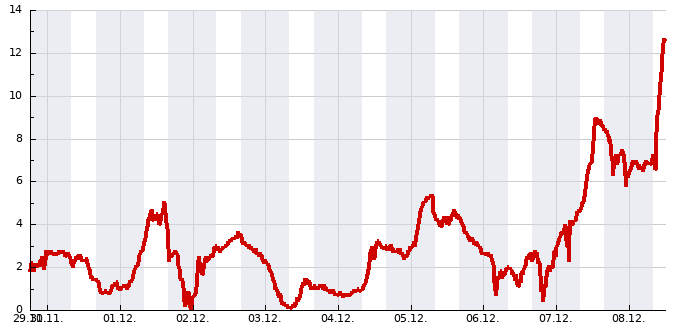 | 19:00 | 6.9 °C | J, 14 km/h | 86 % | 1015 hPa | 0.1 mm | 100% |