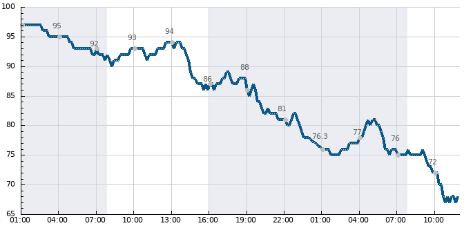 Spojnicový graf udává nejvyšší zaznamenanou průměrnou rychlost větru změřenou za 10 minut v km/h, sloupcový graf zobrazuje nejvyšší zaznamenané nárazy větru (zobrazeny jen pokud přesáhnou 40 km/h).