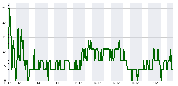 | Nejvyšší průměrná rychlost větru | 16.03.2014 | 15 km/h |